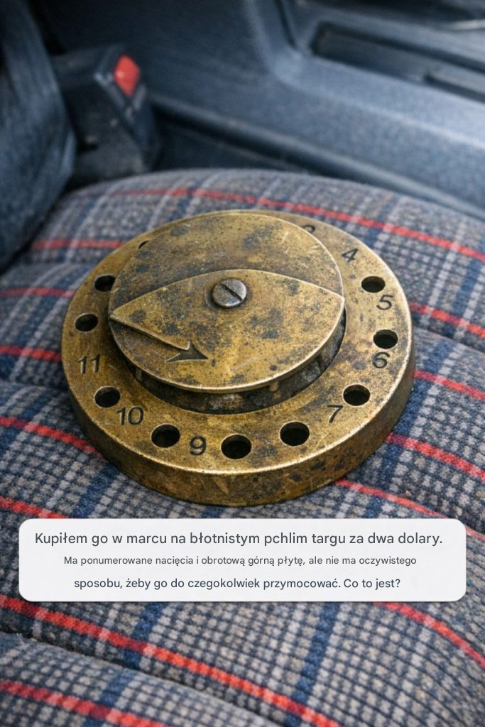 Przedmiot posiadał szereg ponumerowanych nacięć na obwodzie oraz centralną obrotową płytkę. Jego enigmatyczny design sugerował określoną funkcję, jednak nie było widocznych haczyków ani uchwytów, które sugerowałyby, jak go zamocować lub wykorzystać. Ta zagadka tylko wzmogła ciekawość nowego właściciela, przygotowując grunt pod eksplorację jego przeszłości.